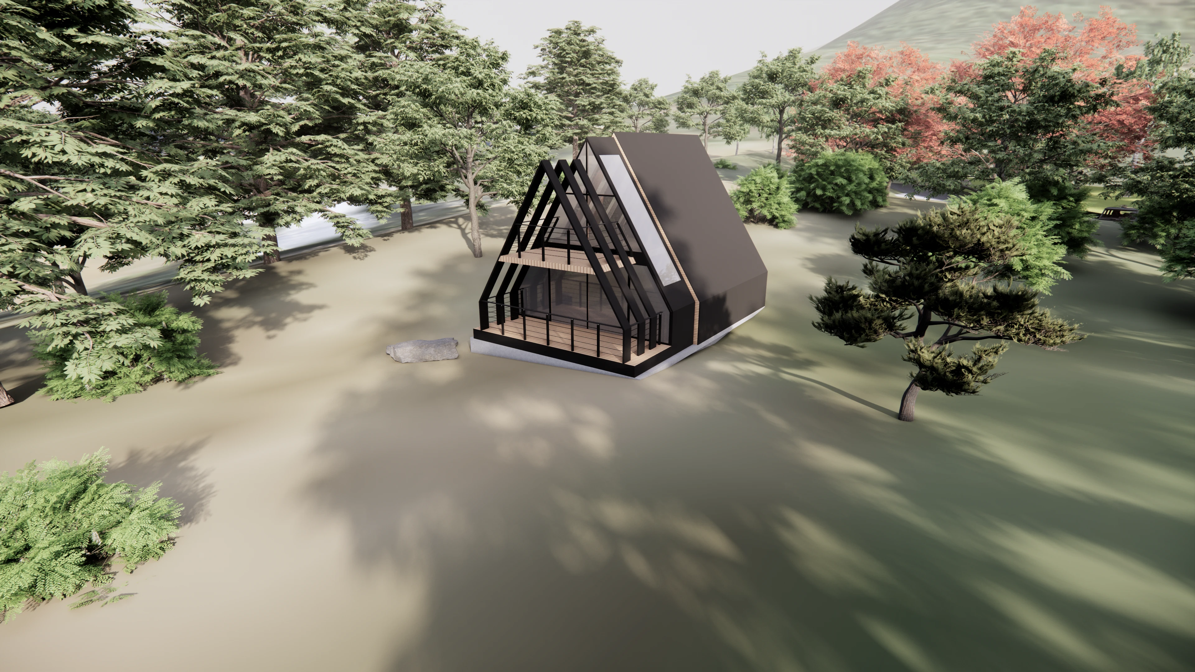 The second design option for the Mir Enclave chalet utilizes a rhythmic A-frame structure that emphasizes verticality and modularity. This version features a deeper integration of timber louvers and a multi-level deck, extending the living space directly into the canopy. The design explores a more skeletal architectural language, where the dark structural ribs define the volume and create a play of light and shadow across the interior timber finishes.