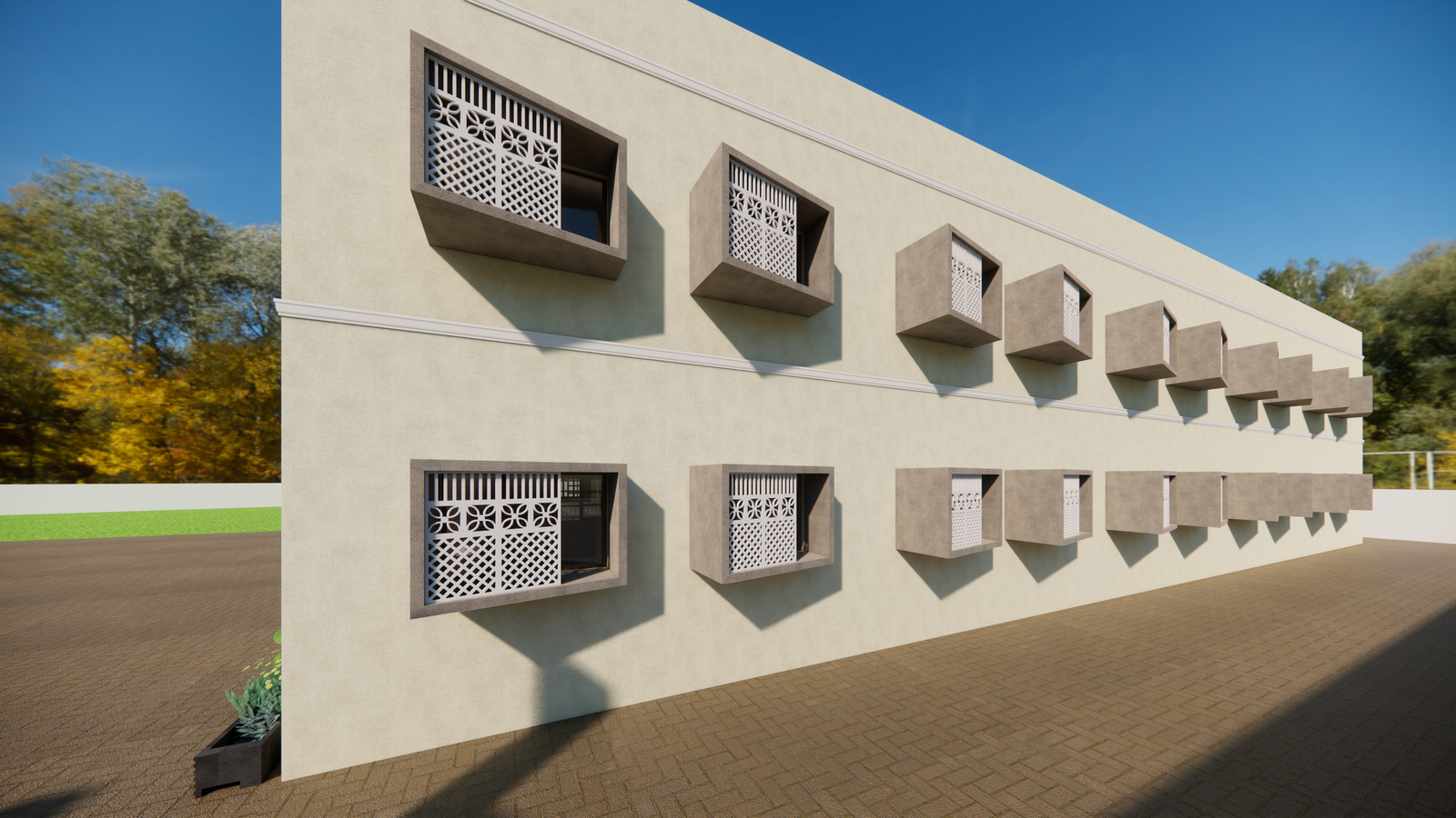 The architecture responds to harsh solar exposure through angled window boxes and concrete jaali screens that filter diffused light. This passive strategy maintains cool interiors and reduces glare, ensuring comfortable classrooms without a reliance on mechanical cooling.
