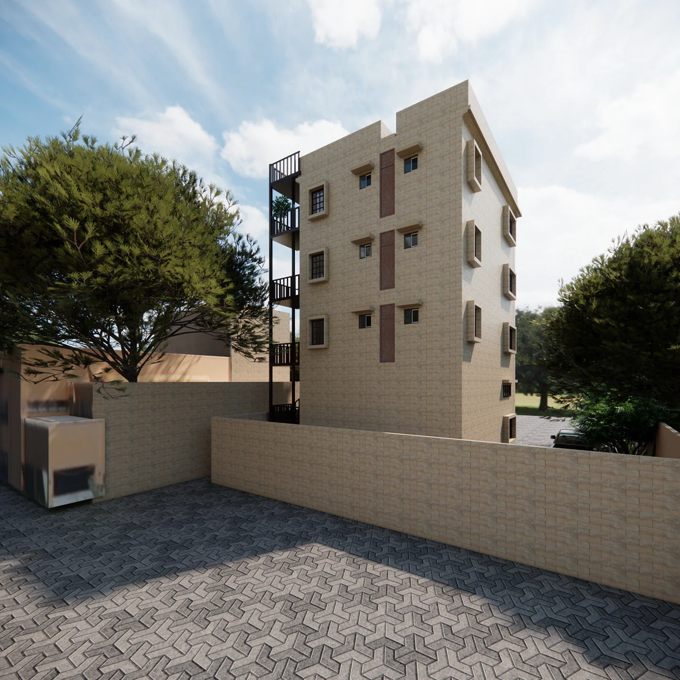 • Light-toned stone cladding inspired by traditional Karachi yellow sandstone architecture.